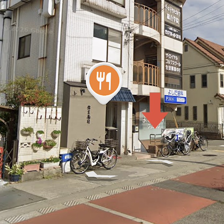 ④200mほど歩くと左手に弥生寿司、よしだ歯科、ロイヤルゴルフが、入ってるビルがありますので、そのビルの地下1階です(バス停からは徒歩4分ほどです)