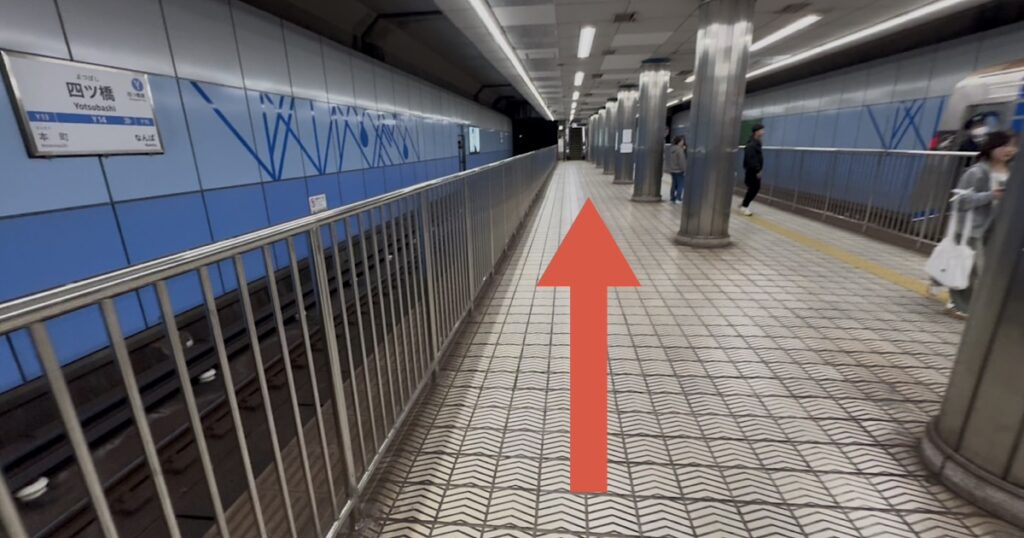 四ツ橋駅を降りましたら、ホームをエスカレーターに向かって進みます。