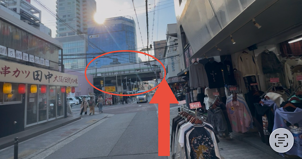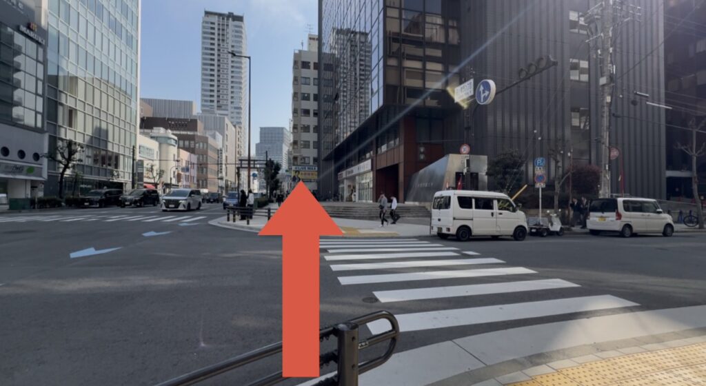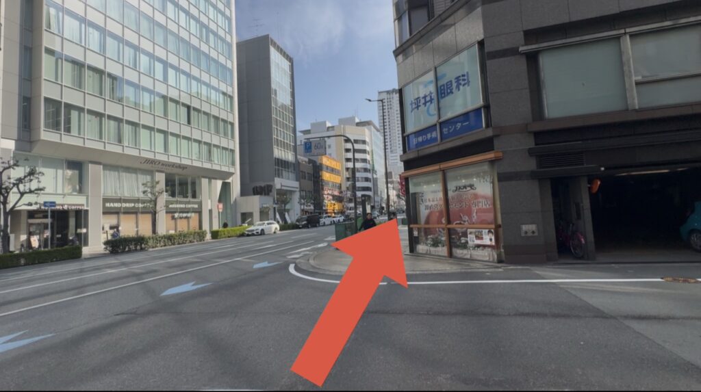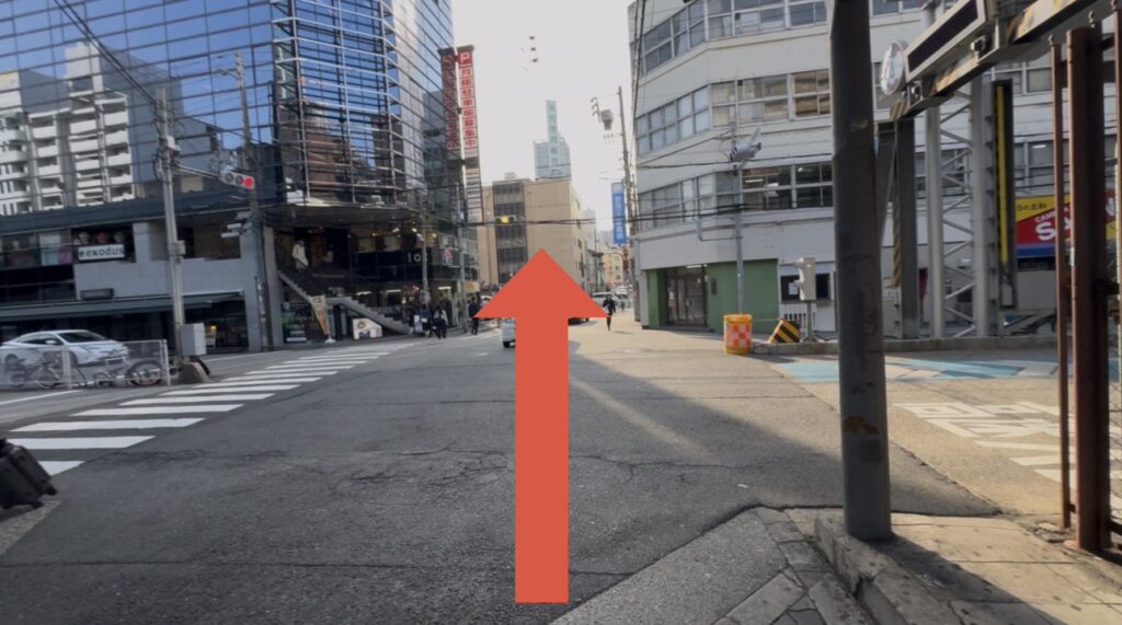 大通りにでます。⭕️の部分は四ツ橋駅の入口です。横断歩道を渡ります。