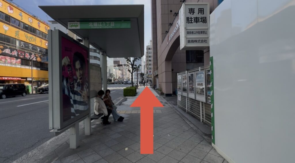 (途中の目印)北堀江1丁目のバス停がありますが、まっすぐ進みます。