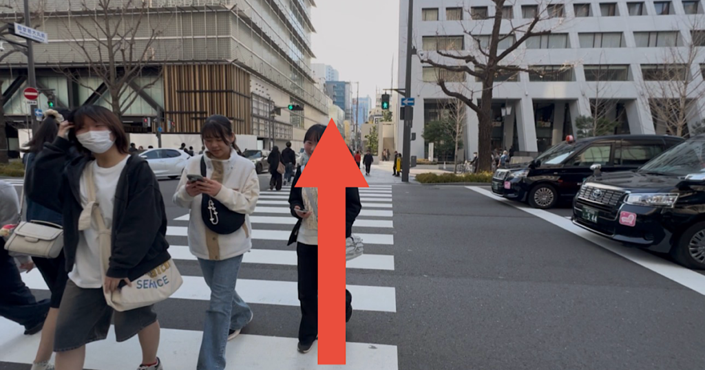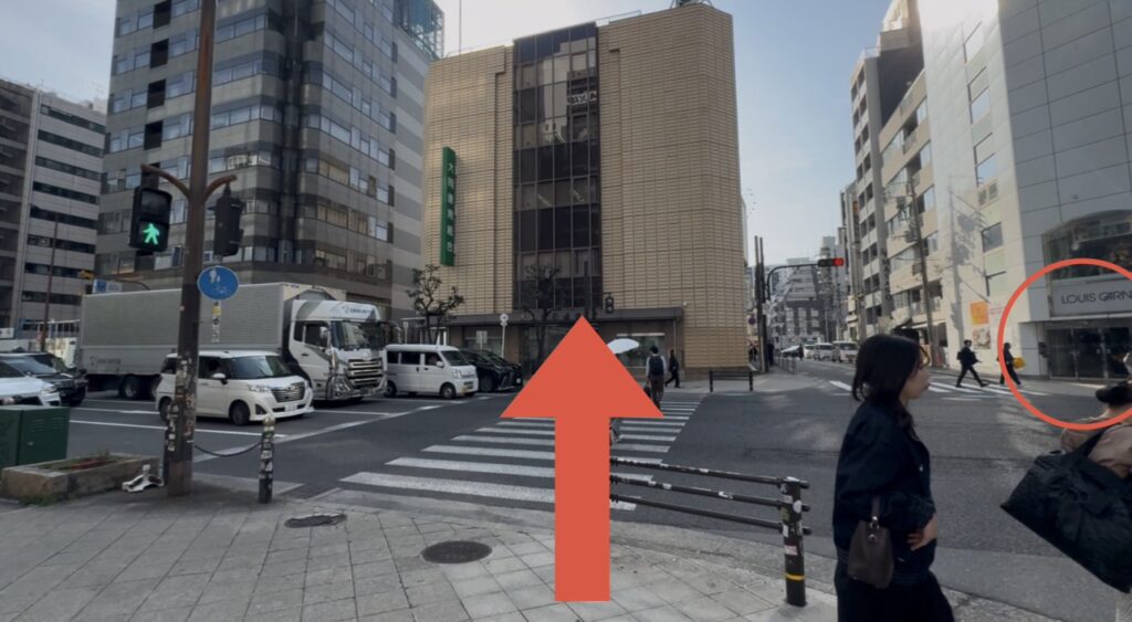 館を出ると向かいに日航ホテルがありますので、左脇の横断歩道を渡りまっすぐ進みます。